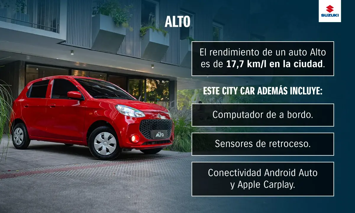 Este city car es perfecto para moverse de un lugar a otro sin la preocupación de gastar altos niveles de combustible, incluso si hay mucho tráfico. En zonas urbanas, el modelo Alto entrega un destacado rendimiento de 17,7 km/l. Por tanto, facilita el ahorro a quienes se dirijan habitualmente a distintos puntos de la ciudad, como su lugar de trabajo, colegios, supermercados o tiendas comerciales.