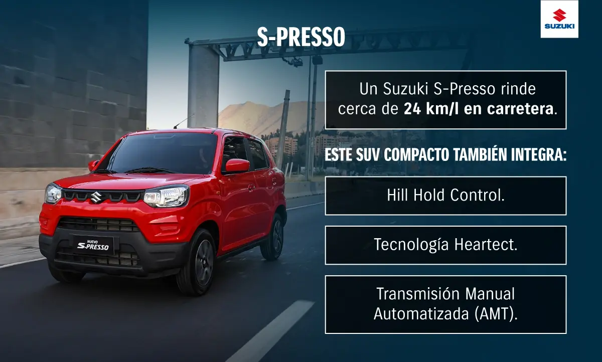 Este renovado modelo es otra prenda de garantÃa al hablar de rendimiento de combustible . En las congestionadas calles de la ciudad alcanza un consumo entre 17 y 18 km/l, mientras que al salir a la carretera se acerca a los 24 km/l . De esta forma, S-Presso se convierte en un claro ejemplo de auto eficiente.