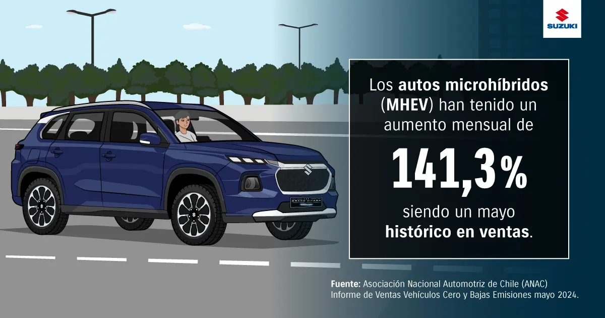 Desde la Asociación Nacional Automotriz de Chile (ANAC) , se informa que a mayo de 2024, los vehÃculos microhÃbridos (MHEV) han tenido un incremento acumulado anual que va en 133,6%, aumentando un 141,3% en el mes anterior y rompiendo un récord de ventas.