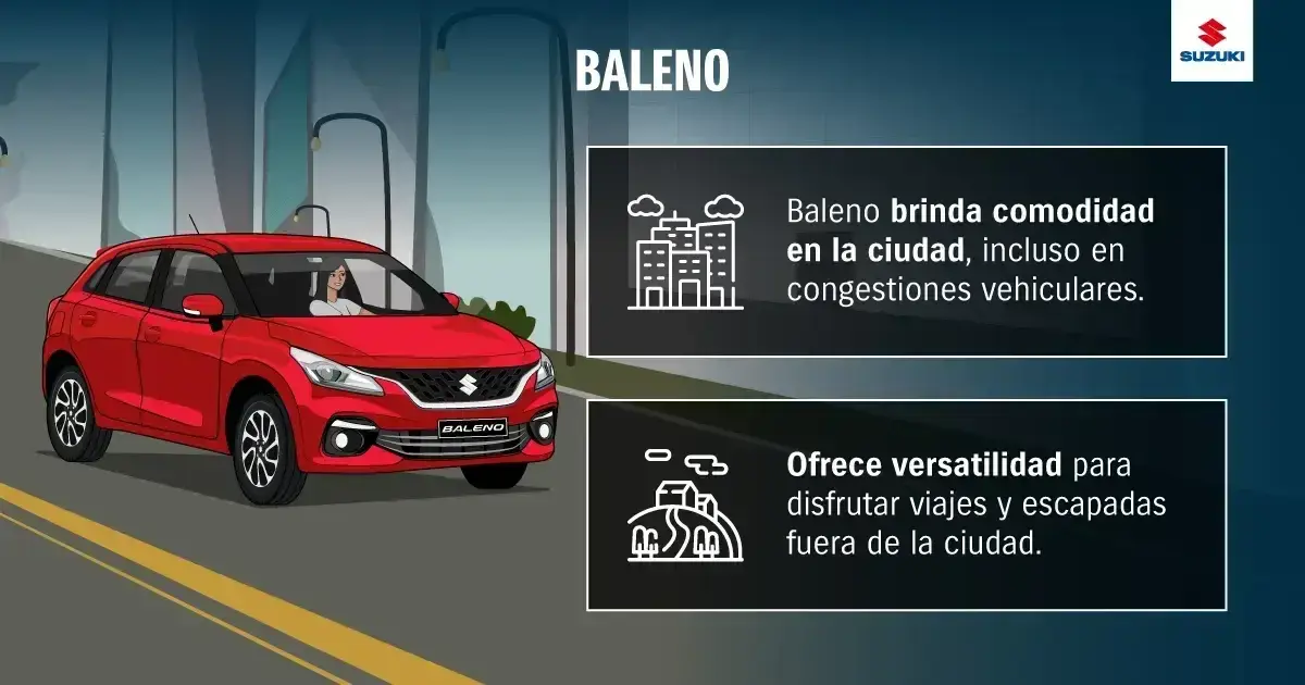 Pero los atributos de Baleno no solo se limitan a la ciudad. Durante fines de semana o feriados en los que se quiere escapar de la ajetreada vida citadina, el excelente rendimiento que ofrece este compañero permite crear grandes historias juntos. Para esto, integra tecnologÃa multimedia que otorga gran diversión a los pasajeros mientras se viaja, asà como tecnologÃas avanzadas de asistencia al conductor, entre ellas el Hill Hold Control, que facilita superar pendientes, mejorar la estabilidad y optimizar el control total del vehÃculo.