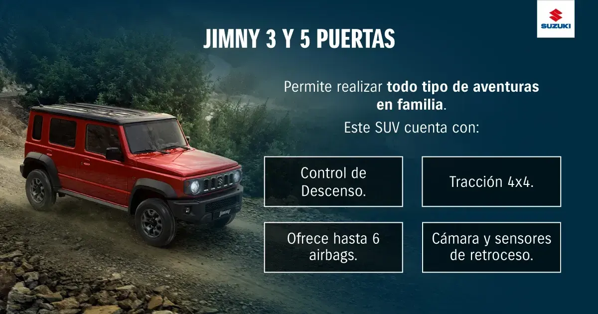 Si una persona busca acceder a todas las comodidades de un SUV, pero su familia no es tan grande, Suzuki le ofrece la versión Jimny 3 puertas, que permite viajar hasta 4 pasajeros . Por su parte, el ejemplar con 5 puertas aumenta el espacio del maletero, que pasa de 85 litros a los 211 litros, además de añadirle más comodidad a los pasajeros. Ambas versiones están diseñadas para la vida off-road.