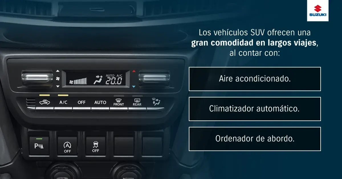 En esta lÃnea, los SUV no defraudan en los componentes que incorporan en su interior. Como muestra, algunos modelos integran aire acondicionado con climatizador automático, ordenador de abordo y sistema de infoentretenimiento.
