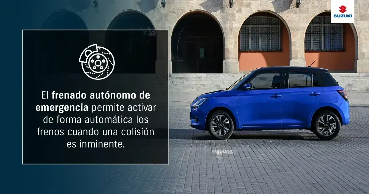 El frenado autónomo de emergencia funciona a cualquier velocidad. De la misma manera, es capaz de reconocer cualquier obstáculo con el que se pueda chocar, ya sea un auto, motocicleta o peatón. Por ende, cumple un papel muy importante en cada recorrido que realice el Suzuki Swift.