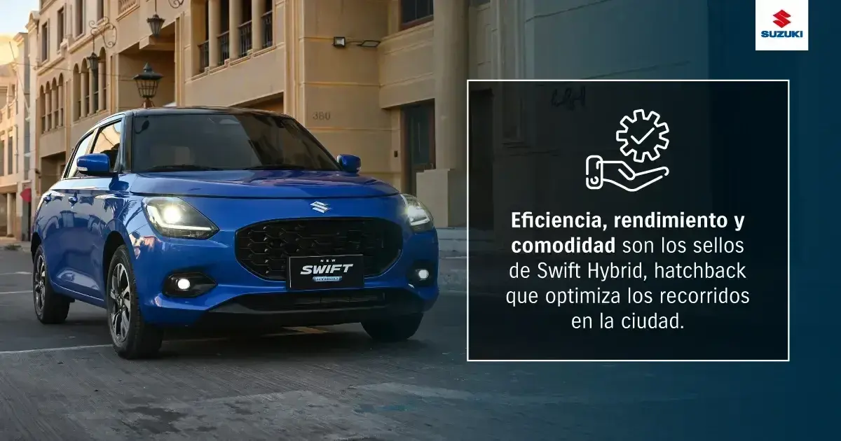 Este hatchback hÃbrido es perfecto para adentrarse en cada rincón de la ciudad . Swift Hybrid facilita los recorridos en calles congestionadas y pequeños pasajes, convirtiéndose en un gran compañero al dirigirse al lugar de trabajo o al ir de compras cada dÃa.