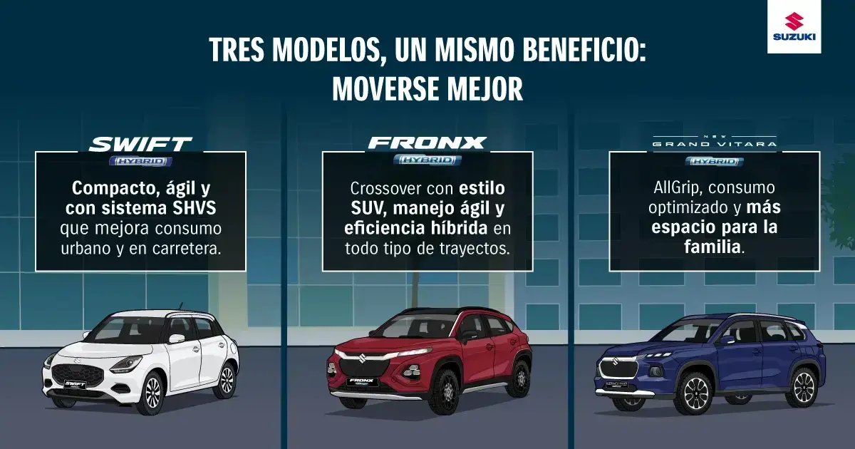 Con Suzuki , esa movilidad inteligente se traduce en el Swift Hybrid , el Grand Vitara Hybrid y el Fronx Hybrid : tres maneras de disfrutar la eficiencia híbrida sin cables ni complicaciones. Al final, se trata de moverse más, gastar menos y seguir conectado con lo que realmente importa: la experiencia de conducir.
