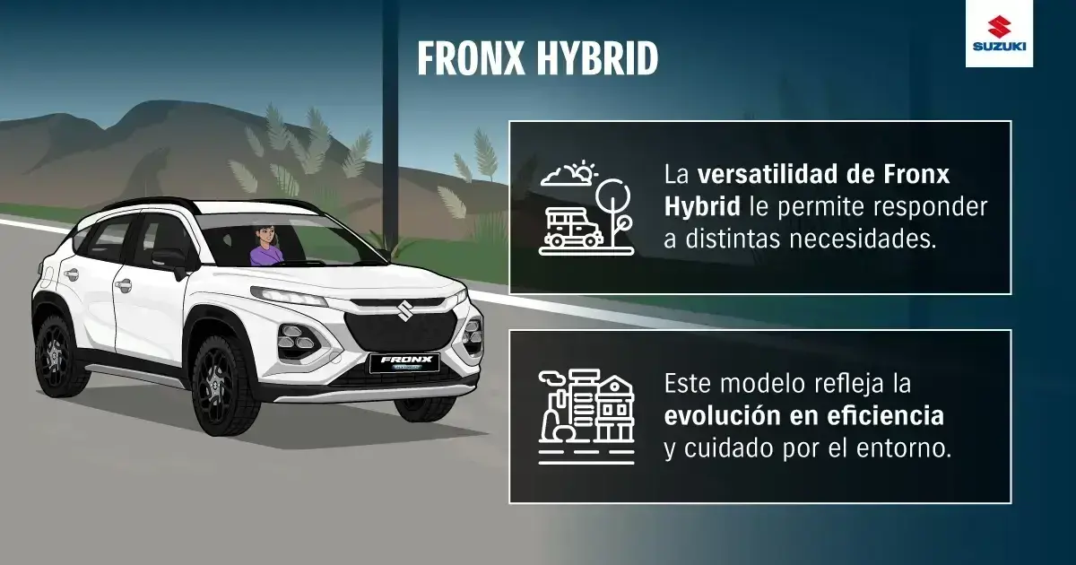 Fronx Hybrid es el vivo ejemplo de un auto capaz de responder a diversos requerimientos. Entre los distintos vehÃculos SUV, este modelo destaca por su gran versatilidad, facilitando los viajes diarios en cada rincón de la ciudad y las aventuras en destinos desconocidos, a través de un motor hÃbrido ligero que logra cautivar a quienes muestran una especial preocupación por el cuidado del medio ambiente.