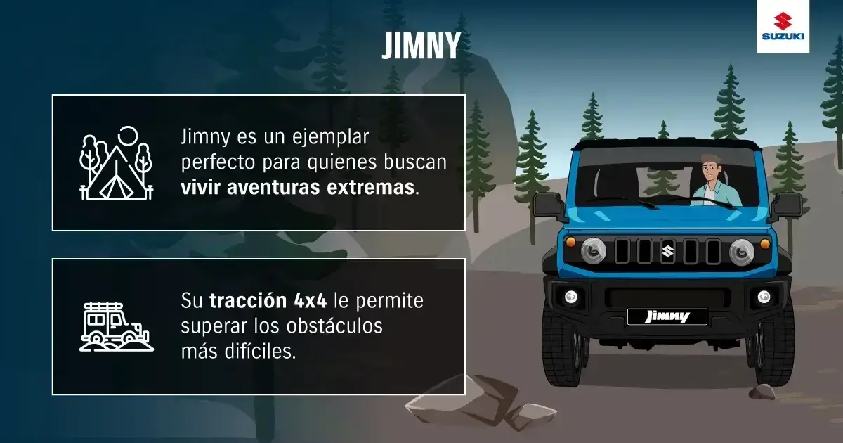 El legendario Jimny es el vehÃculo perfecto para vivir aventuras off-road. Este SUV 4X4, con más de 50 años de historia, no se intimida ante ningún escenario. AsÃ, este ejemplar, que es una fiel muestra del poder de la tecnologÃa, representa un modelo ideal para recorrer caminos irregulares como piedra, barro o nieve.