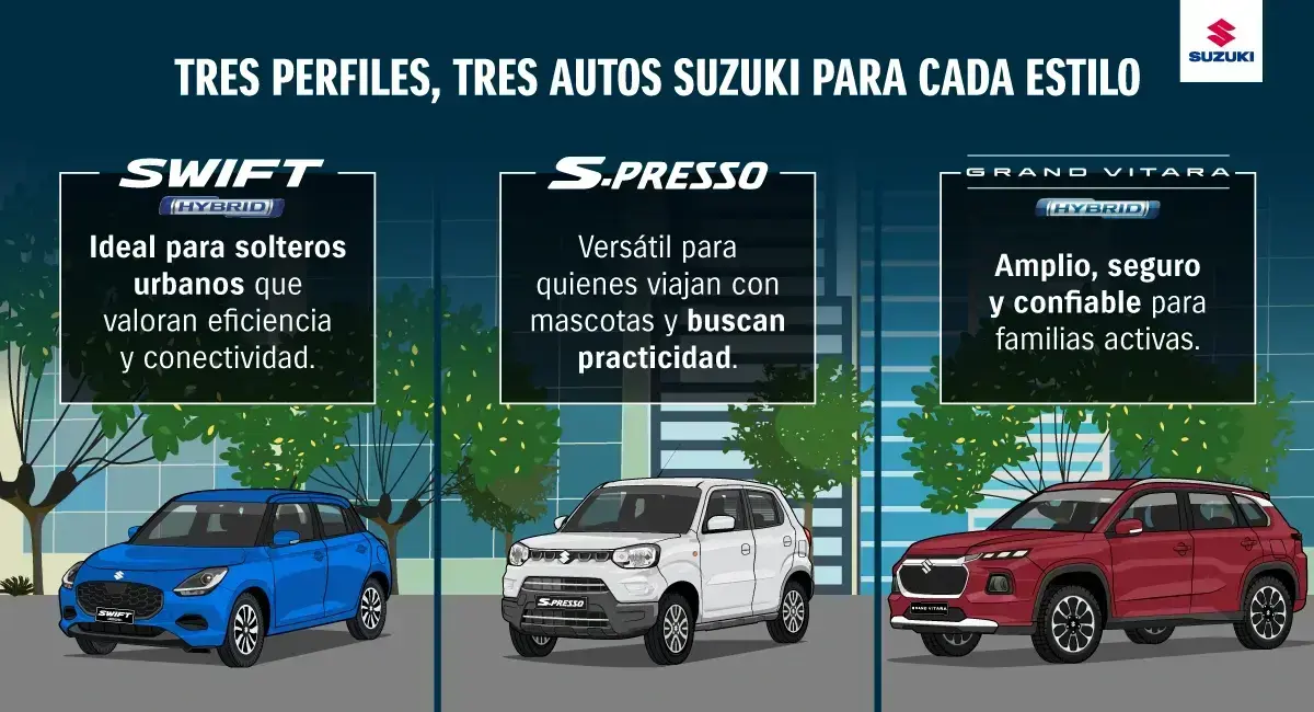 El Swift Hybrid , el S-Presso y el Grand Vitara Hybrid son ejemplos de cómo un vehículo puede alinearse con distintas etapas personales.